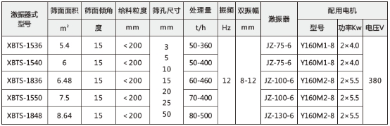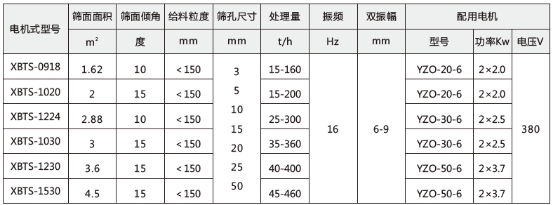 XBTS系列彈臂振動篩面傾斜安裝,角度在20°-35°之間,與其它同類型產品相比具有下列特點: